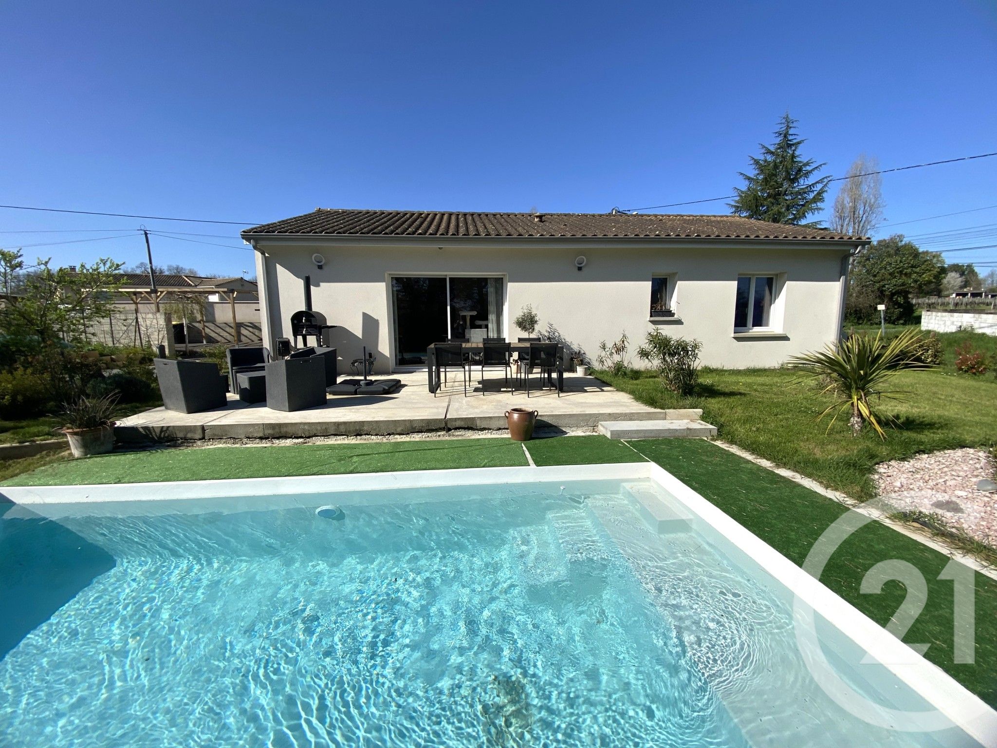 À l'extérieur, une terrasse prolonge l'espace de vie et donne accès à la piscine.
